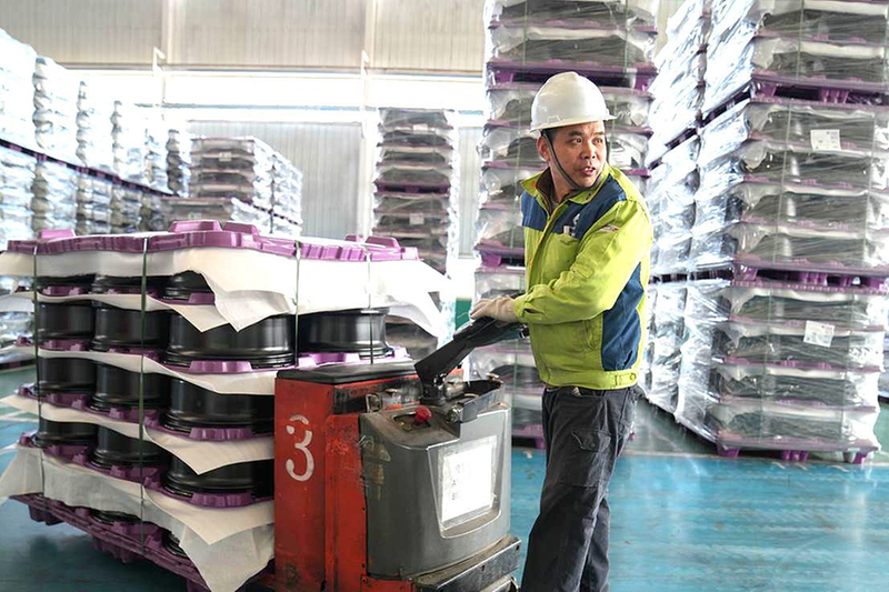 图为位于山东省邹平市焦桥镇的山东六丰机械工业有限公司工人用拖排车运送轮毂。