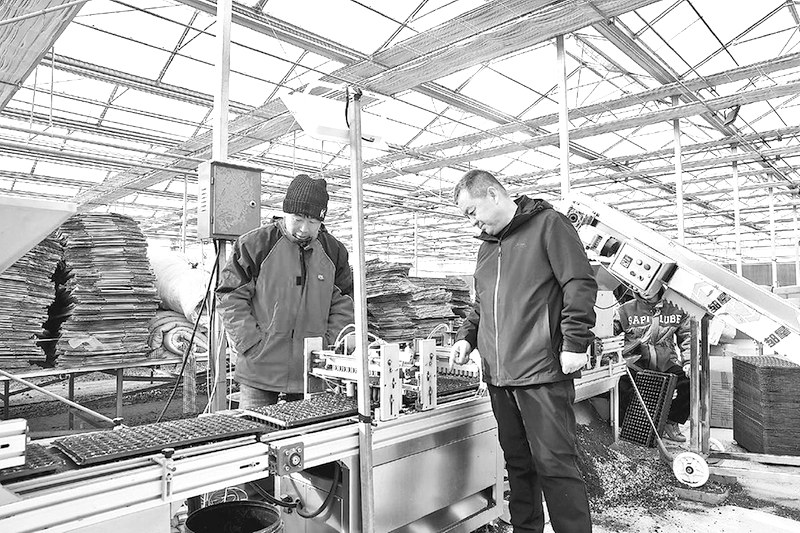 图为工作人员在雨禾种植养殖农民专业合作社智能育苗大棚内查看全自动育苗机播种情况。 陈治武 摄