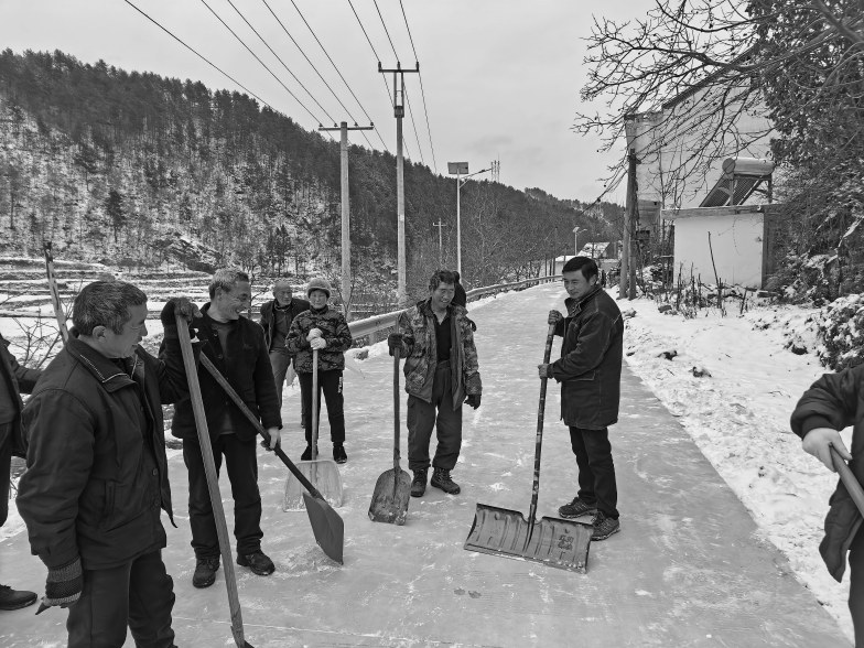 “群众的出行安全是头等大事,雪停就是命令,清雪就是责任!”李银魁深知积雪结冰对村民出行的影响,降雪过后第一时间召集两名驻村工作队员,召开简短工作部署会,明确清雪范围、分工和安全注意事项。随后,工作队主动联系村“两委”,通过入户走访、微信群通知等方式,积极发动村民参与清雪行动,一场“全民参与、共护畅通”的清雪攻坚战迅速打响。