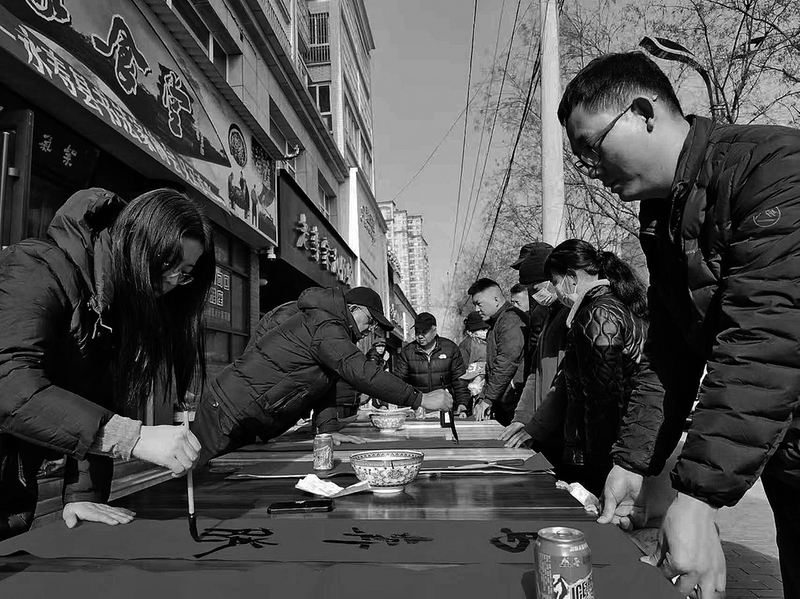图为1月26日,永寿县书法家协会书法家在该县南街挥毫泼墨给群众义务书写春联。通讯员 李建龙 摄