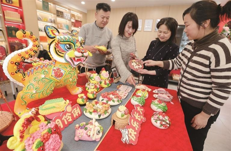 手艺人夏莉莉(右二)介绍骏马系列花馍文创新品。