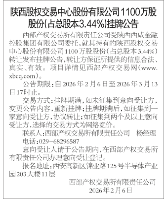 陕西股权交易中心股份有限公司1100万股股份(占总股本3.44%)挂牌公告