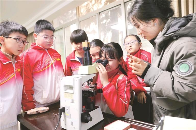 随后,孩子们依次参观了邓家村污水处理厂的污水预处理区、生化处理区、深度处理区、出水区等,听工作人员讲解这些来自家庭卫生间、厨房的污水及工业废水,如何经过一道道工序的“洗涤”,成为可供景观、浇灌使用的净水。不少孩子拿手机记录下污水变清澈的神奇过程。在互动环节中,孩子们好奇地趴在显微镜前,观察污水处理过程中“吃掉”污泥的神奇动物究竟长什么样子。