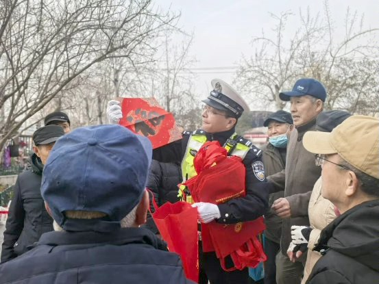 民警向群众发放交通安全宣传手册,围绕日常出行安全、文明交通规范、冬季行车注意事项等内容进行细致讲解,重点提醒群众春节期间出行遵守交通规则,杜绝酒驾醉驾、超员超载、不按规定佩戴安全头盔、闯红灯等交通违法行为,引导大家自觉抵制交通陋习,树立安全文明的出行理念。