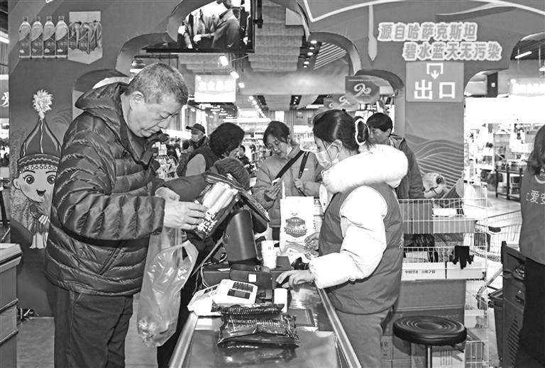 王雅琴向记者展示选购的美食:“你看,哈萨克斯坦的饼干、俄罗斯的红肠、阿塞拜疆的石榴汁,品质都不错,价格和咱国内的产品差不多。过年把这么多国家的食品搬回家,既能添点特别的年味,又能给家里人带来新鲜口味,多好。”