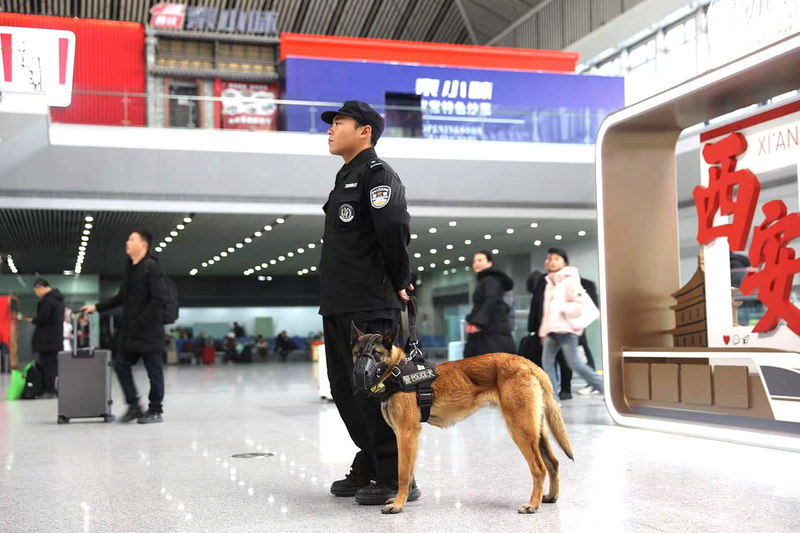 警犬及训导员正在工作,确保旅客安全。