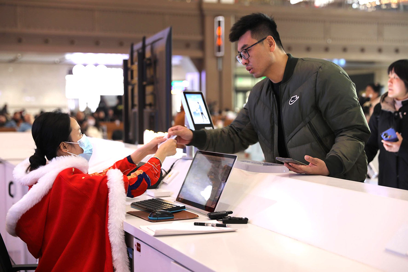 春运期间,西安北站问询台服务人员穿上汉服为旅客提供服务。