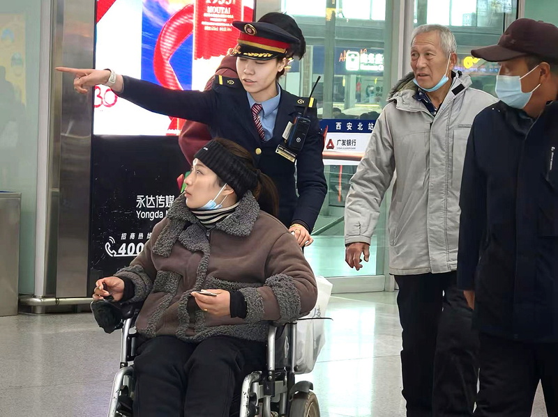 西安北站工作人员正在为出行不便旅客提供服务。