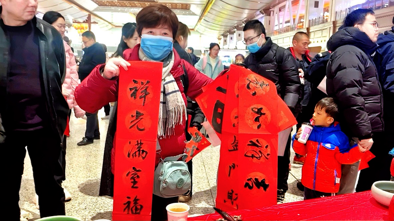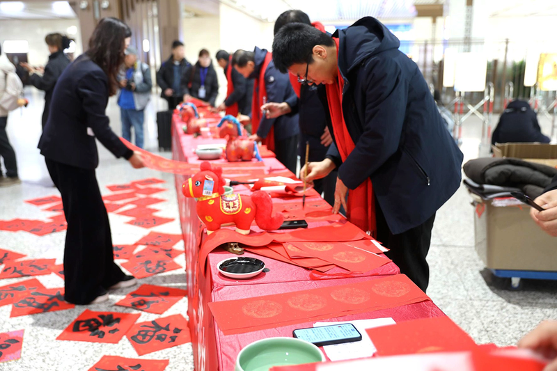 春运首日,中铁西安局集团联合陕西国画院书法家在西安北站现场写作送春联。