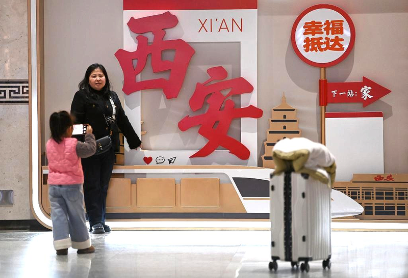 旅客在西安站候车大厅的主题文化墙前留影。 李一博 摄2026年春运启程,车站、机场人潮涌动,到处是人们步履不停归家的身影。有人背着鼓鼓的行囊,装着一年的辛苦与收获;有人牵着孩子,眼神里满是归心似箭;有人踮脚张望,只为第一时间看见等候已久的亲人。一张张略显疲惫的脸上,都藏着同一份期待——跨过人山人海,奔向那盏为自己亮着的灯。