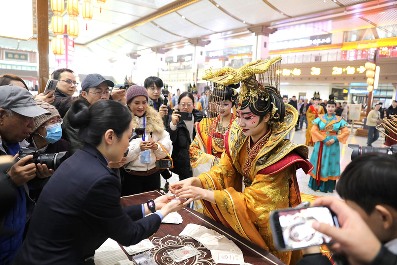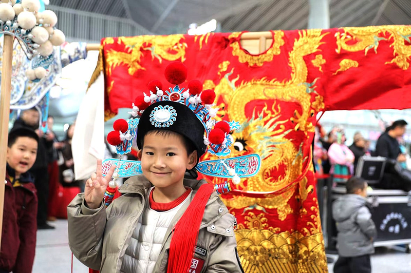 春运首日,中铁西安局联合陕西省戏曲研究院在西安北站做戏曲展演,小朋友们争相与戏服、头面合照,学习中华传统文化。