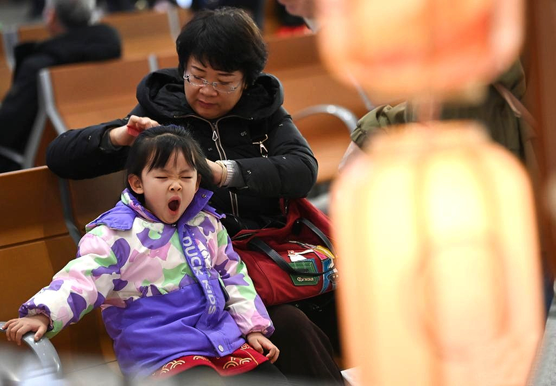 在西安站候车大厅,一位旅客在候车期间为孩子梳头。李一博 摄