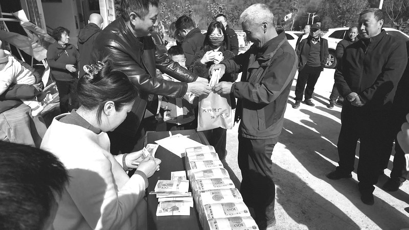 近日,留坝县青桥驿镇蔡家坡村,村民领取2025年度务工工资,现金形式发放让现场群众真切感受到产业发展带来的增收喜悦。 曹娜 摄