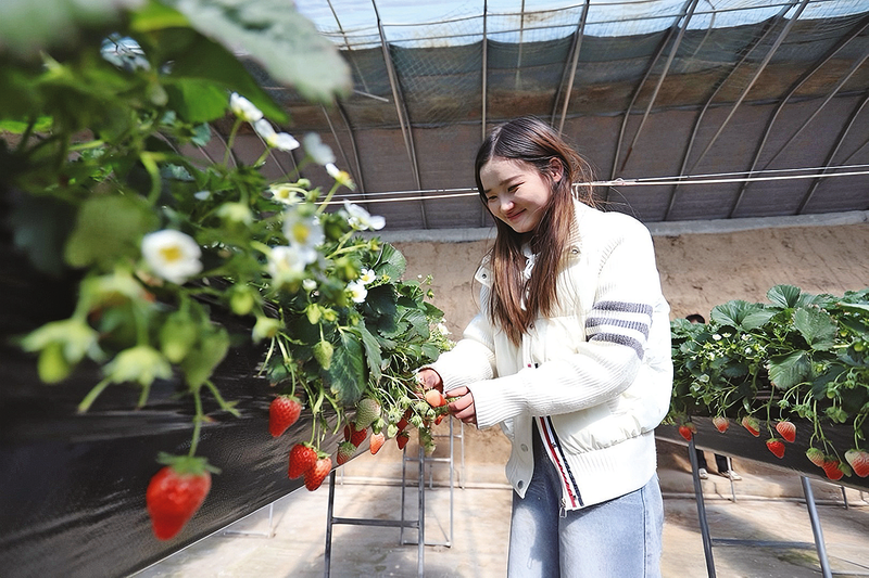 新春至,甘肃省兰州新区秦川现代农业产业园的草莓大棚内果香四溢。鲜红饱满的果实垂挂垄间,游客们穿梭其中,边采边尝,感受“莓”好时光。