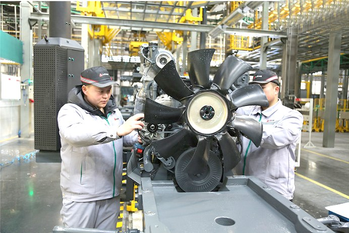 2月24日,在位于山东省临沂市兰山区的临工农业装备有限公司车间内,工人在进行大型农用拖拉机组装作业。