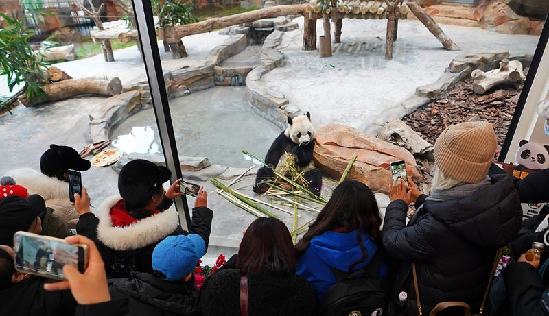 近日,在乌鲁木齐市水上乐园动物园(大熊猫馆)内,游客为大熊猫“宝元”拍照。