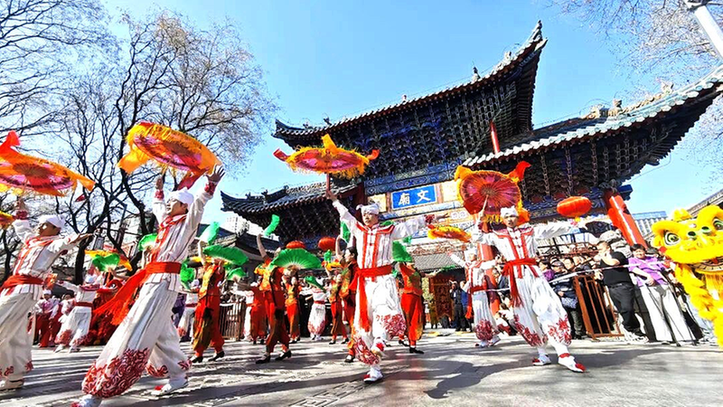当日下午三时,文庙前的祈福鼓声拉开巡游序幕。“开道先锋·萌狮献瑞方阵”中,彩狮摇头摆尾,踩着轻快鼓点跃动腾挪,时而登高采青,时而俯身拜年,憨态可掬的模样引得孩童追跑欢呼,为巡游路线播撒满满的喜庆氛围。紧随其后的“北方情怀·陕北秧歌方阵”气势恢宏,表演者身着大红大绿的传统服饰,手持彩扇、绸带翩翩起舞,唢呐声高亢嘹亮,舞步时而刚健有力,时而舒展柔美,“龙摆尾”“卷白菜”等经典队形变幻间,尽显黄土高原的淳朴与豪放。