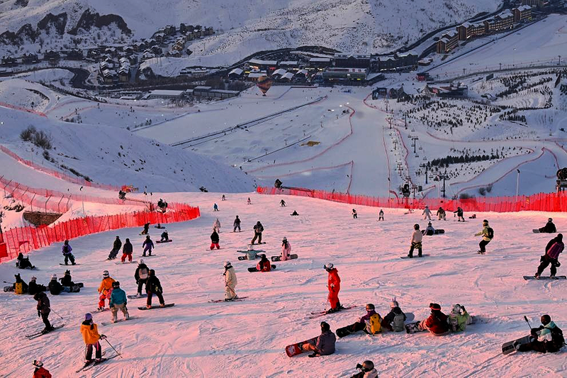 滑雪爱好者在新疆阿勒泰将军山国际滑雪度假区滑雪。