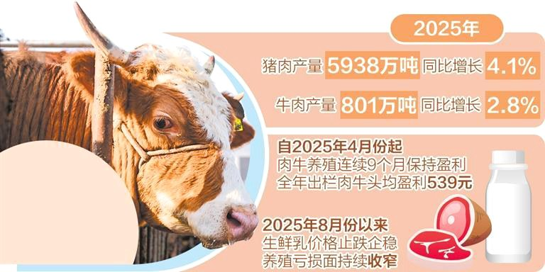 总体看,农业农村部指导各地加快落实稳产能、强金融、降成本、促消费等系列举措,推动肉牛养殖扭亏为盈,奶业生产筑底企稳。在各方面共同努力下,2025年全国牛肉产量801万吨,同比增长2.8%,自2025年4月份起,肉牛养殖连续9个月保持盈利,全年出栏肉牛头均盈利539元;2025年8月份以来,生鲜乳价格止跌企稳,养殖亏损面持续收窄。