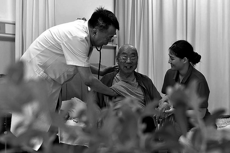 2025年8月20日,在山东省郓城颐合养老服务中心,医生魏登芹为参保职工长护险的秦增节检查身体。 郭绪雷 摄国家医保局近日发布《2025年医疗保障事业发展统计快报》,全民参保率巩固在95%,医保基金支出首次突破3万亿元。