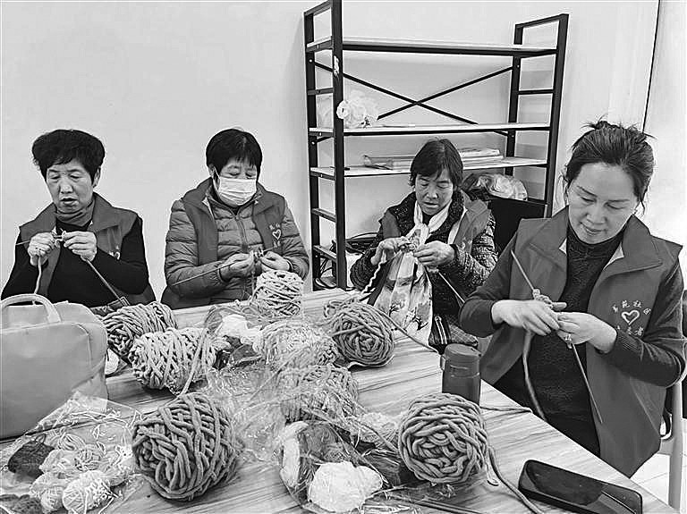 在社区党委书记袁亚红的牵头下,20多位有编织手艺的居民聚在一起,钩针、毛线等材料也早已备好,大家围坐一起,指尖翻飞忙碌着。