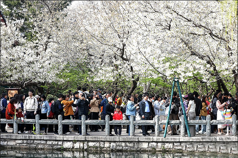 春回泉城,花事正浓。3月22日,济南五龙潭公园内樱花竞相绽放,粉白相间的花簇与碧波潭水交相辉映,吸引众多市民和游客前来踏青赏花、打卡拍照。