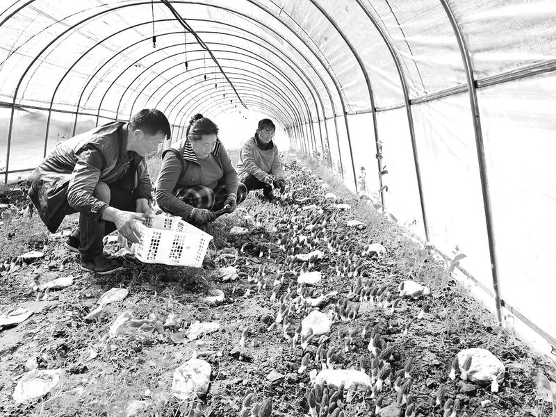 在镇安县庙沟镇蒿坪村羊肚菌种植基地,务工人员正采摘羊肚菌。