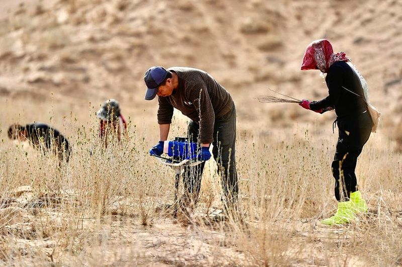 近日,随着天气转暖,宁夏中卫市组织治沙工人开展宁夏境内腾格里沙漠固沙锁边带补种补植工作,通过及时补种耐旱沙生植物,不断巩固治沙成果,筑牢黄河上游生态屏障。