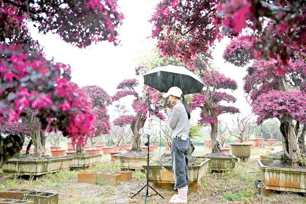 日前,在金华婺城区新狮街道下裴村的盆景长廊里,村民在花丛中冒雨直播,向网友推介自家种植的红花檵木盆栽。