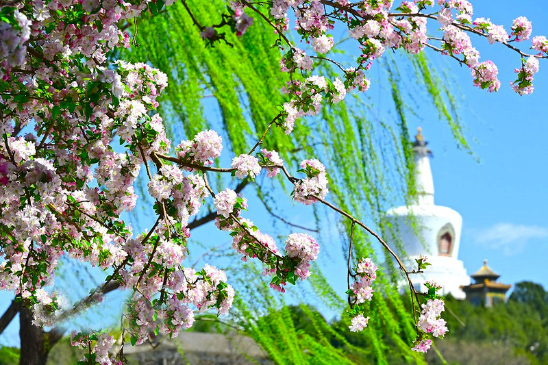 近日,北京北海公园的海棠花竞相绽放,与白塔相映成景。