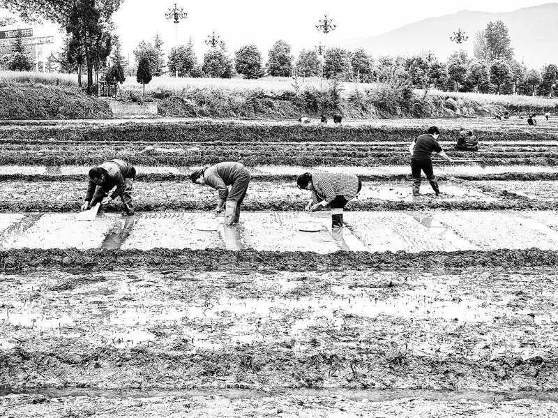 梁山镇荣国村农户正在寄插水稻苗秧。 何祥斌 摄