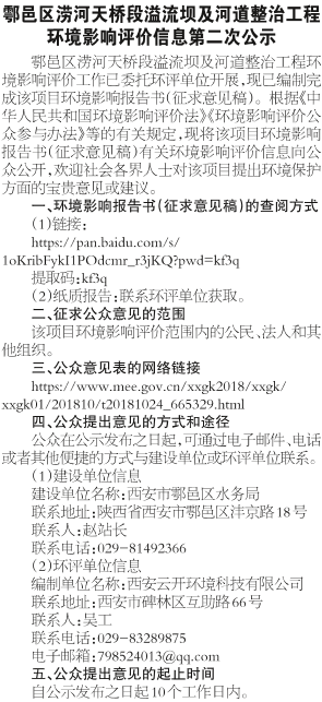 鄠邑区涝河天桥段溢流坝及河道整治工程环境影响评价信息第二次公示