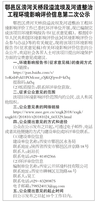 鄠邑区涝河天桥段溢流坝及河道整治工程环境影响评价信息第二次公示