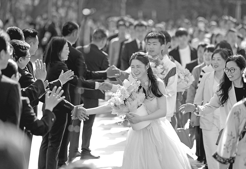 近日,渭南高级中学成人礼活动现场,学生们走过“成人门”与老师击掌致意。