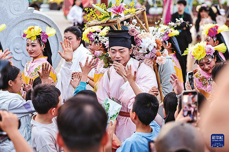 图为演员扮演的“背花郎”在陇南市武都区万象街举行的沉浸式快闪活动中与孩子们互动。